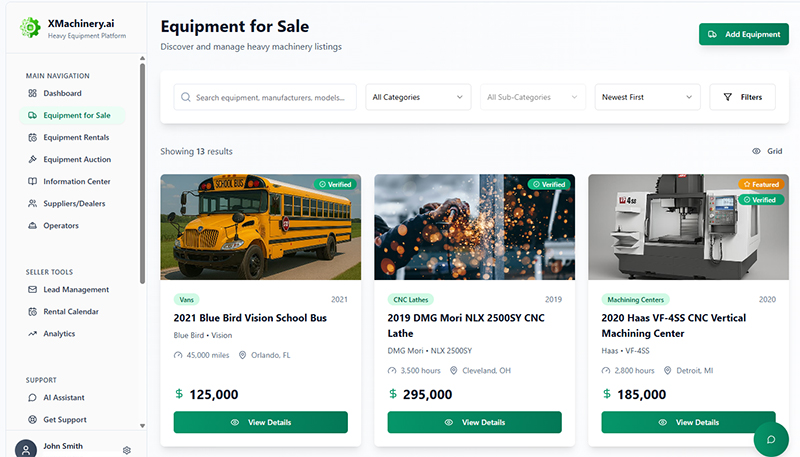Members access a comprehensive suite of services. The A.I. Buyers Assistant ensures a seamless and enhanced buying experience. Seller/Dealer Inventory management streamlines listings. The XMachinery platform provides training, resources, and robust data analysis tools, empowering you with valuable insights for informed decision-making in the equipment procurement marketplace.